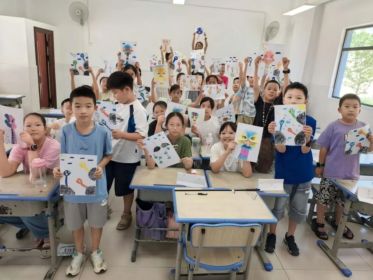 今天是九里阳光支教的第一天。踏入教室前我是紧张不安的,但是当我见到同学们时,他们的热情、乖巧,让我暗下决心:一定要更努力地将课堂呈现出来,让更优质生动的画面跃然纸上。课堂上,老师和同学们一起进行了击鼓传花的游戏,孩子们积极将名字写在黑板上;接着通过“动物园里有什么?”的小游戏引出了今天的课程《鸵鸟创意画》,最终完成了各式各样、色彩缤纷的鸵鸟!第一次课程的顺利进行,让我有了上好这几天课的信心!加油!