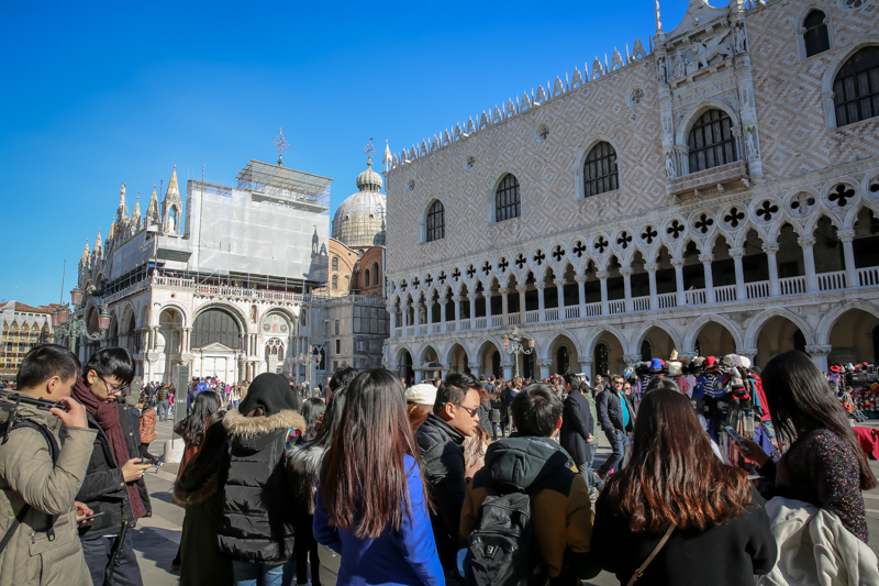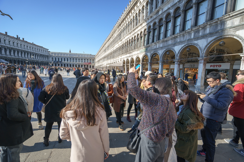 午时10点55分,访学团跟随向导安迪经叹息桥,过总督府,前往圣马可广场进行参观。站在圣马可广场的中央,安迪向访学团介绍道:“圣马可广场是威尼斯的中心广场,可分为大广场和小广场两个部分。圣马可小广场中伫立着早年间威尼斯总督所居的官邸、世界上最古老的图书馆,更有精致秀美的圣马可大教堂,因而被称为集政治、文化和宗教信仰为一身的‘三合一广场’。而圣马可大广场之上,则存留着威尼斯共和国的检察院以及拿破仑为自己所建造的行宫,更曾获得拿破仑的高度赞誉,称其为‘世界上最美的客厅’。”此外,安迪还表示:“位于圣马可大教堂旁边的圣马可钟楼是威尼斯岛上最高,也最年轻的建筑。它曾在1902年坍塌,后经修复,又重回了原来的面貌。虽然它不甚精致,但却是具有独特意义的建筑,伽利略曾在这座钟楼上,用自制的天文望远镜观察到了月球上的环形山,这是人类第一次看见月球上的山,也是人类历史上一个伟大的创举。”语毕,更示意访学团成员自行在威尼斯进行参观。