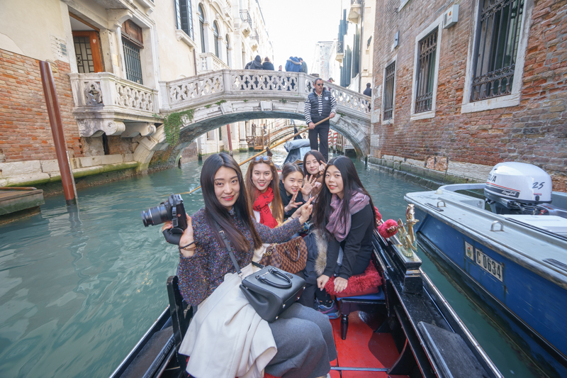 经威尼斯跨海大桥,访学团穿过泻湖,一路向威尼斯码头前行。途中,领队老师马林向访学团成员详细介绍了威尼斯的历史及文化。他认为,威尼斯是一个特殊的所在,在这里,人们不能开车,只能步行,甚至连自行车也不行。由于它建在水中,人们出行只能依靠船只,而‘贡多拉’——一种特殊的小船,也就成了威尼斯所独有的交通工具。此外,马林老师还笑言:“意大利有三宝,水上明珠威尼斯,文艺复兴的摇篮佛罗伦萨,永恒之都罗马,今天便要去看看‘水上明珠’了。”