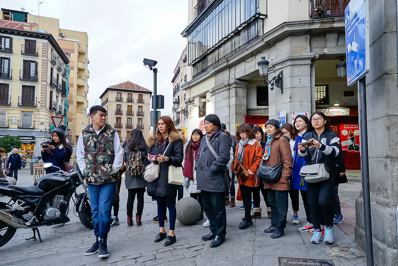 参观完毕,访学团一行从卡洛斯三世大街穿过,经伊莎贝拉二世广场,步行至太阳门广场,领略马德里古城风貌。太阳门广场,通常简称Sol,是马德里的市中心,从广场上有很多条道路向外延伸。广场上有一个“零起点”标志,西班牙全国所有的公路里程碑都从这开始向外计算,马德里市的门牌号也以这里为起点。站在广场的中心,马林老师向访学团介绍了位于太阳门广场一侧的马德里市政厅,并示意访学团细看市政厅的墙壁。只见市政厅大门两侧的墙上张贴着中文“春”字,并印有新春快乐几字,足可见西中友谊之深厚,访学团成员均为此而感到欣喜,并纷纷拿出相机,记录下这温馨的时刻。
