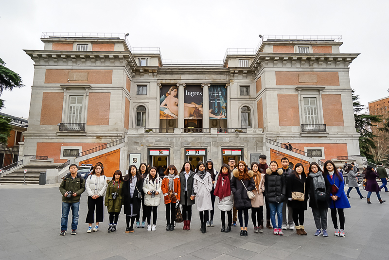 最后,访学团在马林老师的指引下前往西班牙伟大画家戈雅的展馆,并瞻仰其大作。展馆展示了戈雅早期画风严谨的宫廷画作品,及后期画风急变的表现主义作品。其中有《裸体的玛哈》、《着衣的玛哈》、《阳伞》等,吸引了同学们驻足欣赏,并为大师的作品所深深震撼。对此,马老师感慨道:“早期的戈雅内心意气风发,为皇室画出了不少肖像作品。而到了后期,戈雅亲眼目睹了自己国家被英国攻陷,目睹了一个王朝的失败,从此内心完全崩溃,画风亦因此而骤变,开始诉说自己内心世界。而一个真正的艺术家,是需要拿出自己的内心的,戈雅做到了这一点,这一点也最终成就了他。”此外,马老师还认为,在观赏戈雅的作品《吞其子的农神》时,其阴暗的画面和画面上恐怖的人物神情都会让人感到不寒而栗,但亦能因此而深感隐藏于其画面背后的痛苦。戈雅是一个在理想与技法方面全面打破了十八世纪传统的画家,也是新传统的创造者。正如古代希腊罗马的诗歌是从荷马开始的一样,近代绘画亦是由戈雅始。