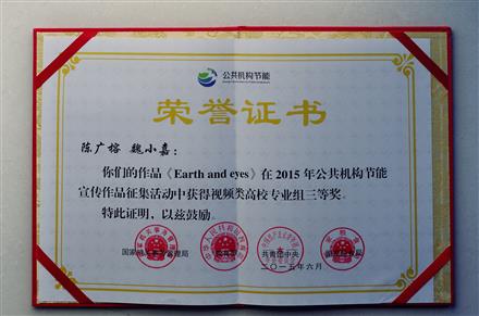 H小说 代表学校参加2015年公共机构节能宣传作品征集活动,获评“优秀组织奖”,研究生陈广榕、魏小嘉的作品《Earth and Eyes》获得视频类高校组三等奖。本届大赛由由国家机关事务管理局、教育部、团中央、国家粮食局联合举办,涉及节水、节电、节粮以及节能环保等主题。