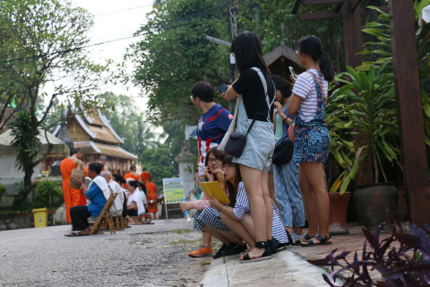 (摄影 王铭毓)九月七日清晨,同学们走在小城街巷感受琅勃拉邦传统布施。一列列身穿黄色袈裟的僧人赤足鱼贯着走上街头接受信众的布施。整个布施过程只有静静的脚步声。每一个人都平静而自然。在这个以小乘佛教为主的国家,人们的宗教生活和日常生活早就合二为一。布施结束,青年僧人装着化缘而来的煮好的黏米,以及一些饼、水果的布袋回到寺庙或一些老僧人先乘船到对岸,留少年僧人清扫街道。
