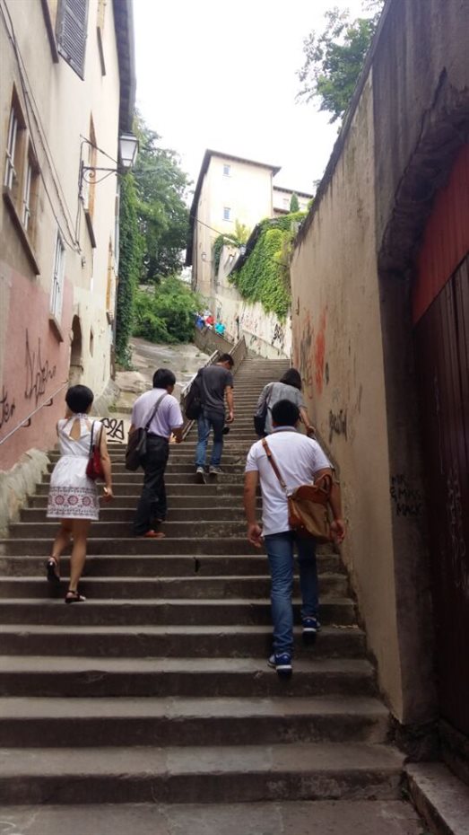 当地时间22日,当代艺术系教师离开瑞士,抵法国第二大城市里昂。里昂是文艺复兴时期名城,法国最大河流罗纳河穿城而过。被称也祈愿山的富维耶山耸立在老城上方。沿着陡峭的阶梯,爬到富维耶山顶,站在富维耶圣母堂身后,可以俯瞰全城。大大小小的土红色房子密布在罗纳河周围,蔚为壮观。里昂老城1998年被评为世界文化遗产,是中世纪和文艺复兴时期的杰出作品。