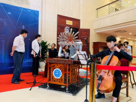 自主研发的智能音乐情感机器人“海百合”二代参加了本次闭幕式,承担了红毯迎宾仪式的全场音乐演奏,热烈欢迎张定宇、李德仁、段凯等十七位杰出的科技工作者和抗疫功臣代表入场。