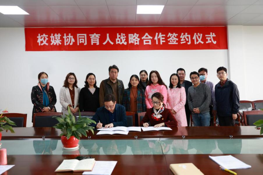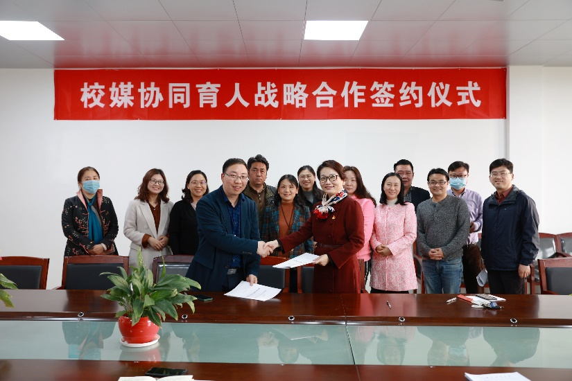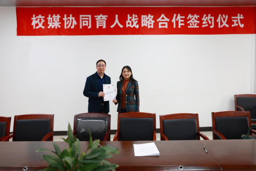 党委书记郭秀蓉代表学院与一点资讯湖北地区总代理映盛中国副总裁杜永海签订校媒协同育人战略合作框架协议,学院副院长张梅珍教授为杜永海颁发了客座教授聘书。