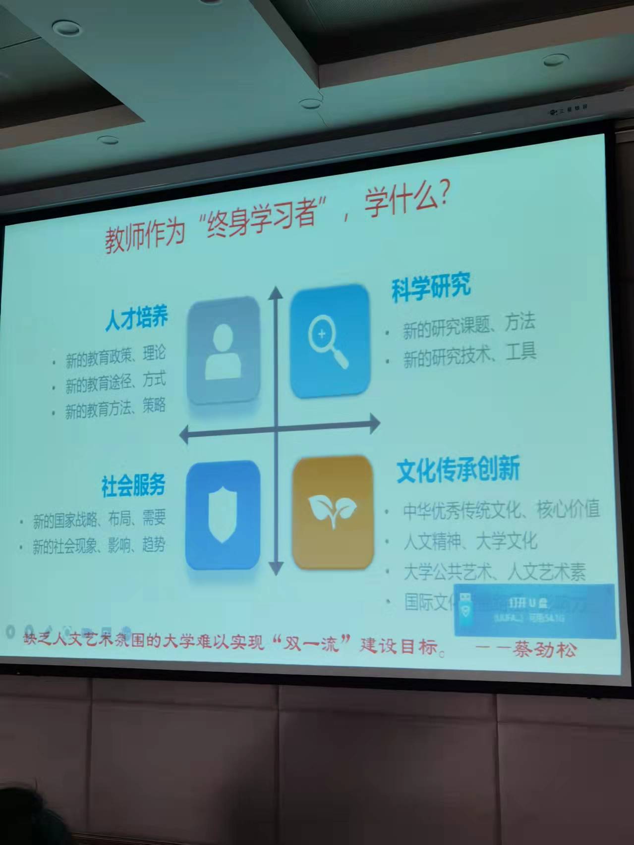 教师职业能力提升计划专题培训”第三场在1104学术报告厅如期举行, 外国语学院刘芳副教授作题为“高校教师教学研共同体建设--理论与实践”的主题报告,报告由党委书记郭秀蓉主持,全体教职工参加。