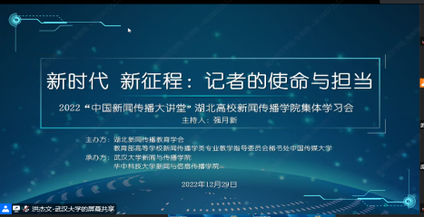 (通讯员于梦涵 王琦)2022年12月29日下午是支部主题日活动时间,为创新支部学习形式,进一步深入贯彻学习党的二十大精神,下午14:30,新闻传播系支部组织动员师生参加以“新时代 新征程:记者的使命与担当”为主题的2022年中国新闻传播大讲堂——湖北分会场在线学习会,来自省内23所高校、2000余名师生参加,H小说