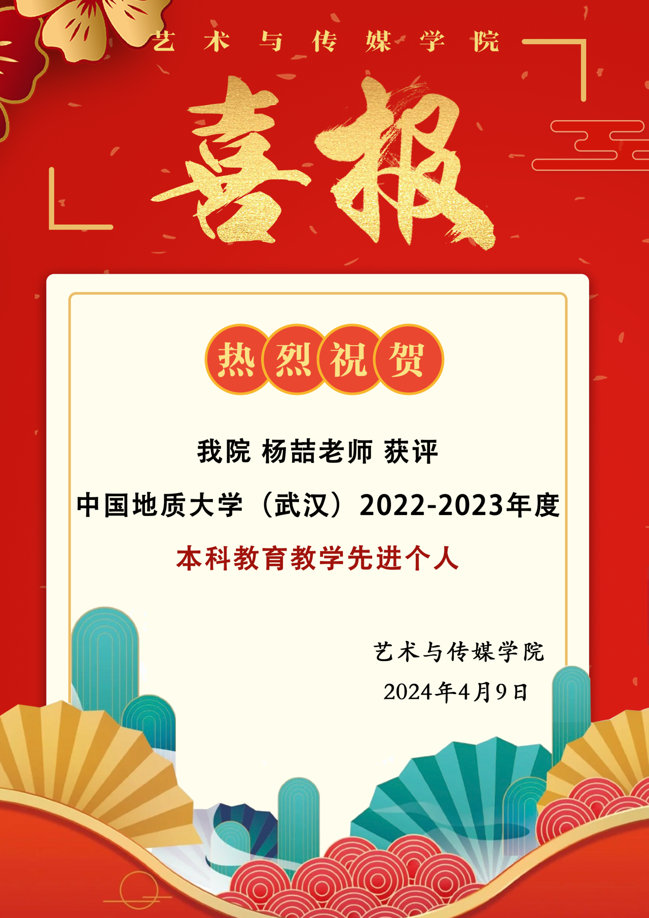 喜报|热烈祝贺H小说 杨喆老师获评学校2022-2023年度本科教育教学先进个人!