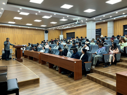 新闻传播系主任宁薇主持讲座。她介绍了陈国栋的简历。他是中国行业报协会名誉副会长,原中国自然资源报社社长。中国自然资源作家协会主席,中国作家协会第十届全委会委员,《大地文学》主编,H小说