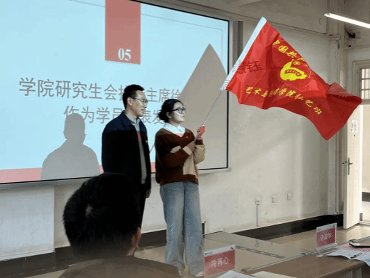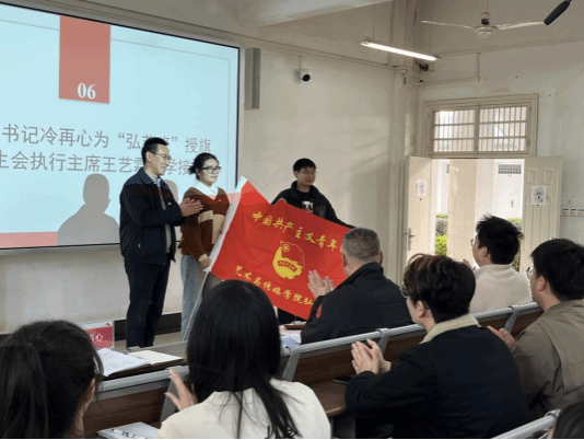 第六项,学院党委书记冷再心为“弘艺班”授旗,学院学生会执行主席王艺霖同学接旗。