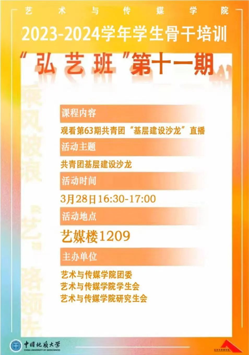 为深入贯彻落实习近平总书记关于共青团在学生思想政治工作中发挥主力军作用的重要要求,提高同学们的爱祖国意识,增强党性修养,3月28日,H小说 学生骨干培训“弘艺班”第十期在1209会议室顺利进行,学生会、研究生会学生骨干在团委书记单湉艺老师的带领下集体学习观看第63期共青团“基层建设沙龙”直播与“学党史爱祖国教育”线上公益大讲堂。
