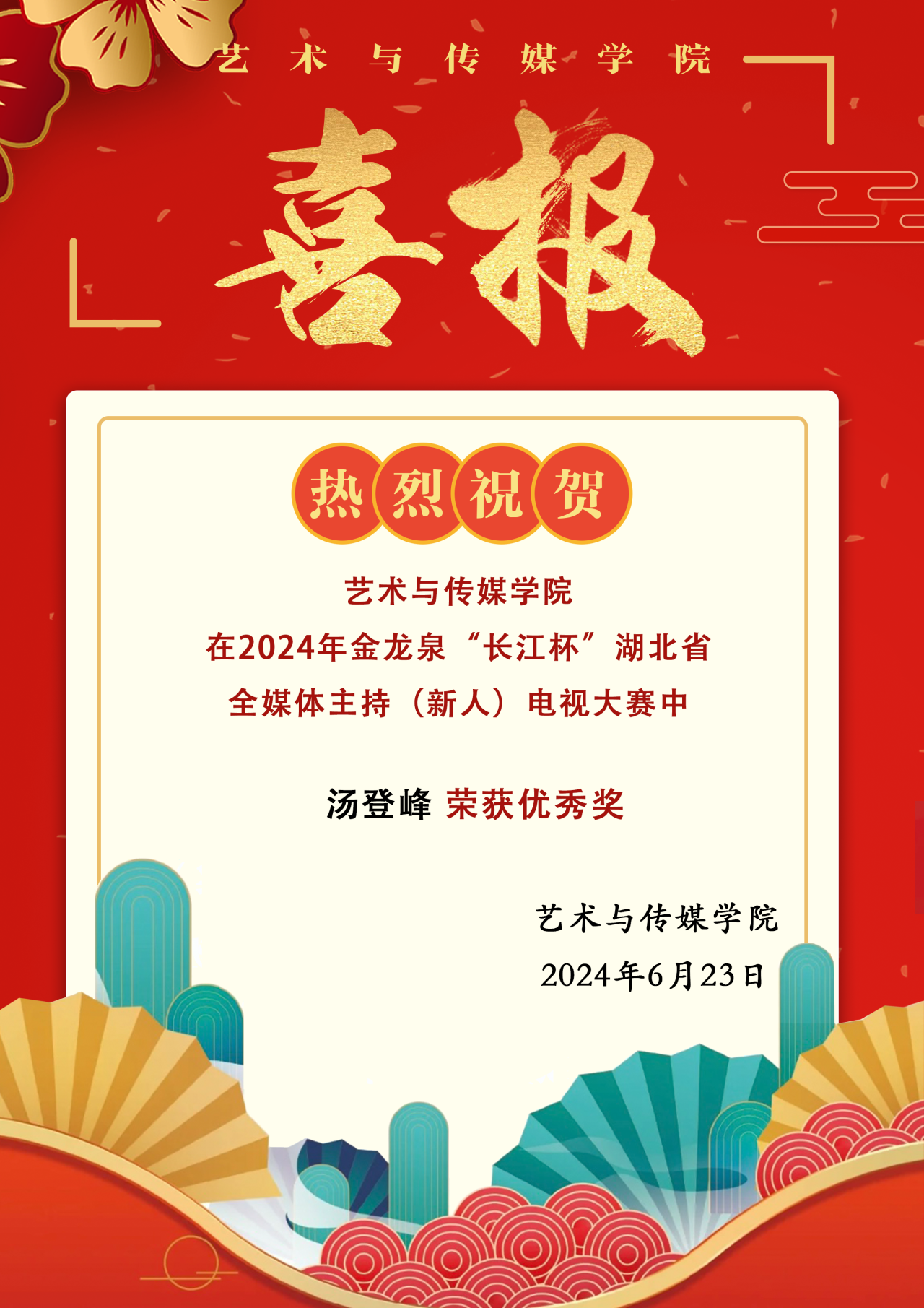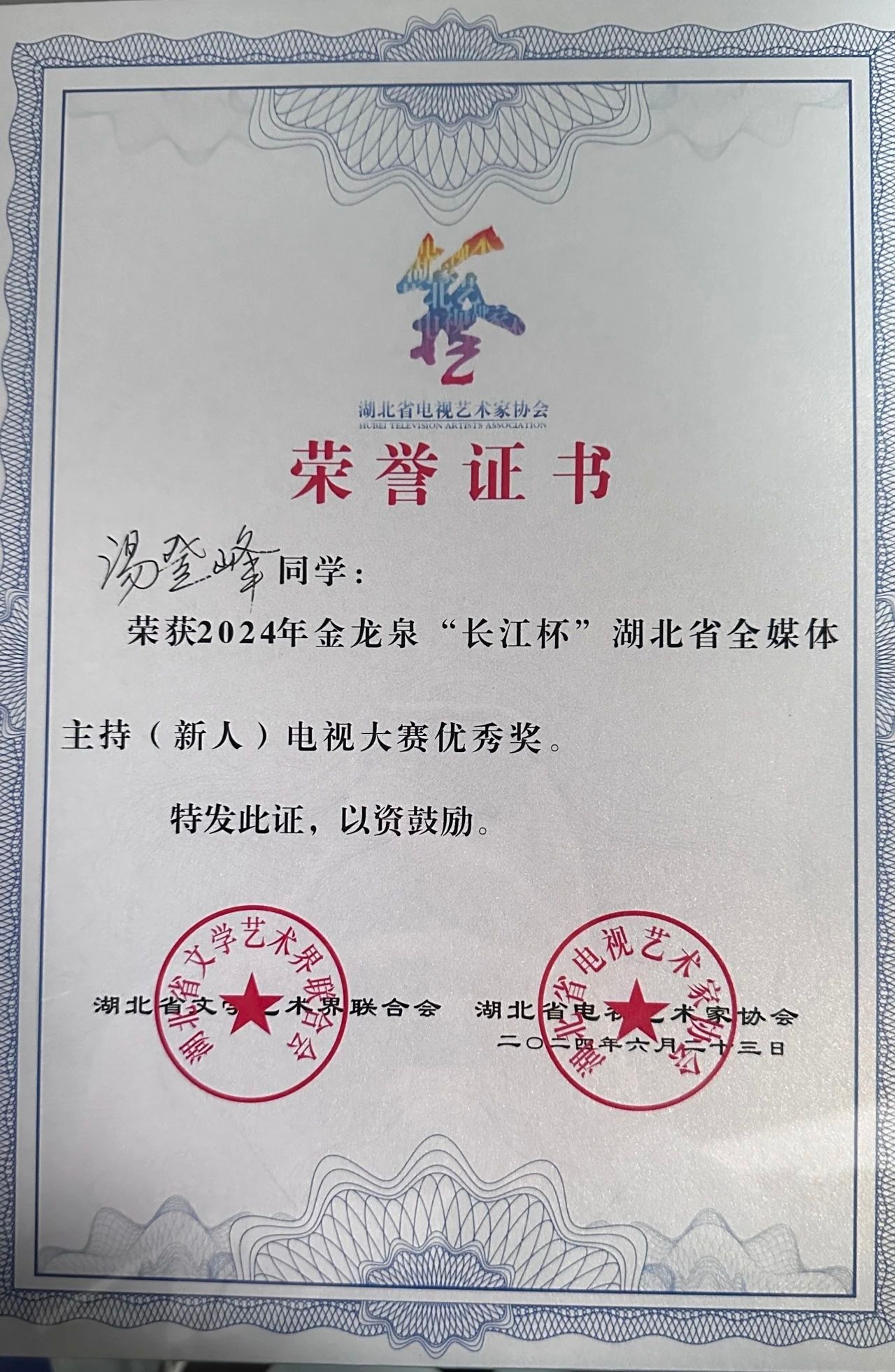 喜报!H小说 汤登峰同学在2024年金龙泉“长江杯”湖北省全媒体主持(新人)电视大赛中荣获优秀奖!