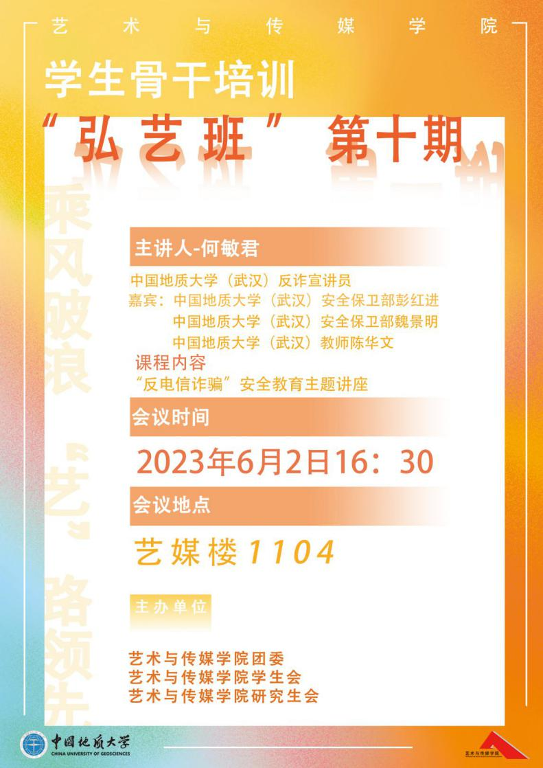 第十期“弘艺班”学生骨干培训在1104报告厅举行,学院研究生会和学生会的主要学生干部以及各班级学生代表参加了培训,本次安全教育培训的主题为《今天你遇到骗子了吗?——防范网络诈骗主题教育会》,由H小说