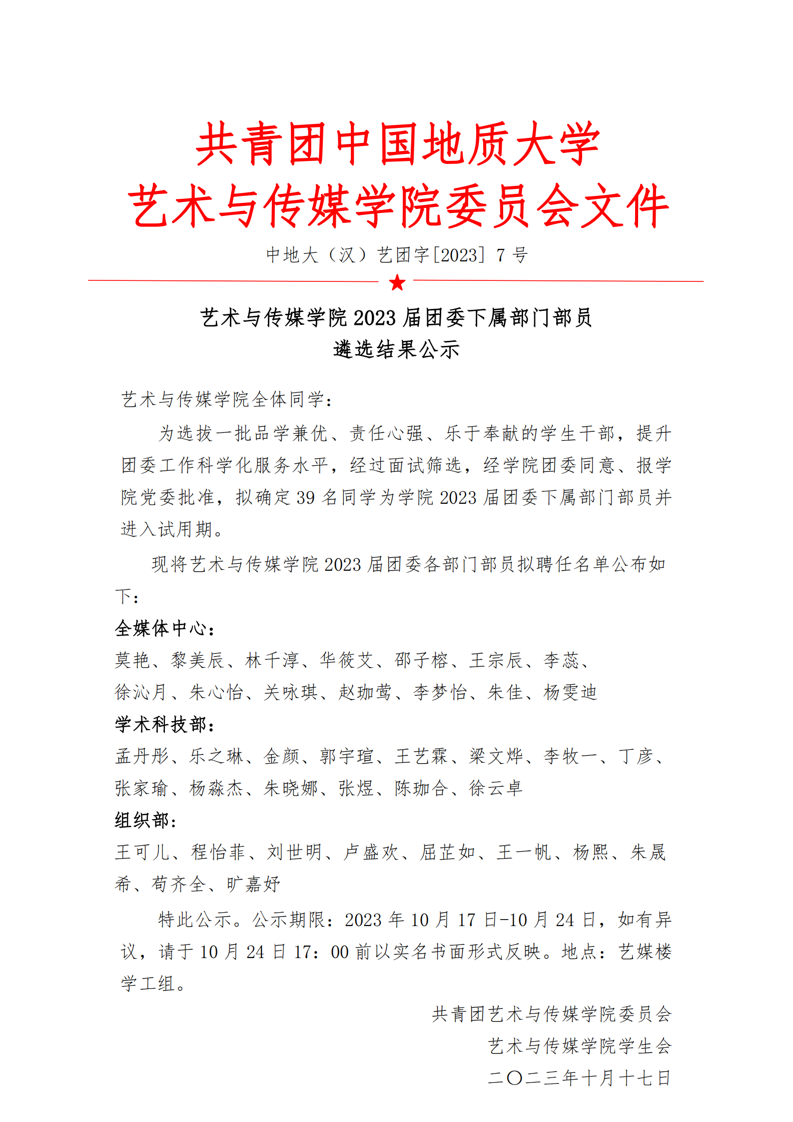 通知 | H小说 2023届团委下属部门部员遴选结果公示