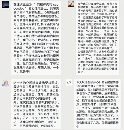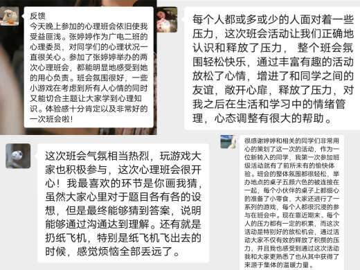 在大二上学期,考虑到有些同学,经过大学一年的适应,仍无法正确减缓自身压力,对自己的日常生活造成了一定影响。因此,为了给学生的心灵赋能,引领学生度过轻松愉快的学习生活。我们召开了以《寻智慧应对,与压力为友》为主题的心理班会,旨在教给同学们从多角度看待问题,挖掘自身积极应对压力的经验,丰富自己应对当下和未来压力的方法策略。