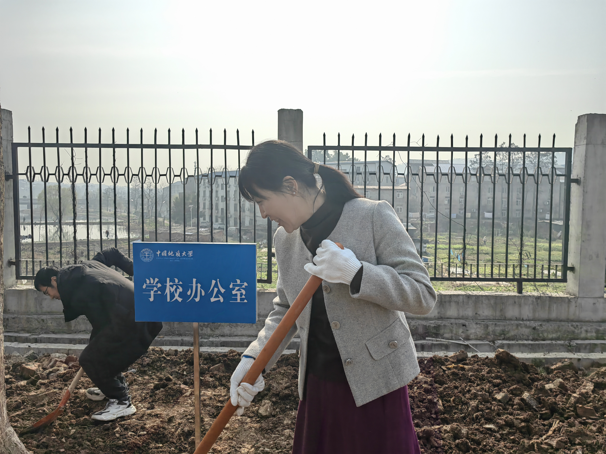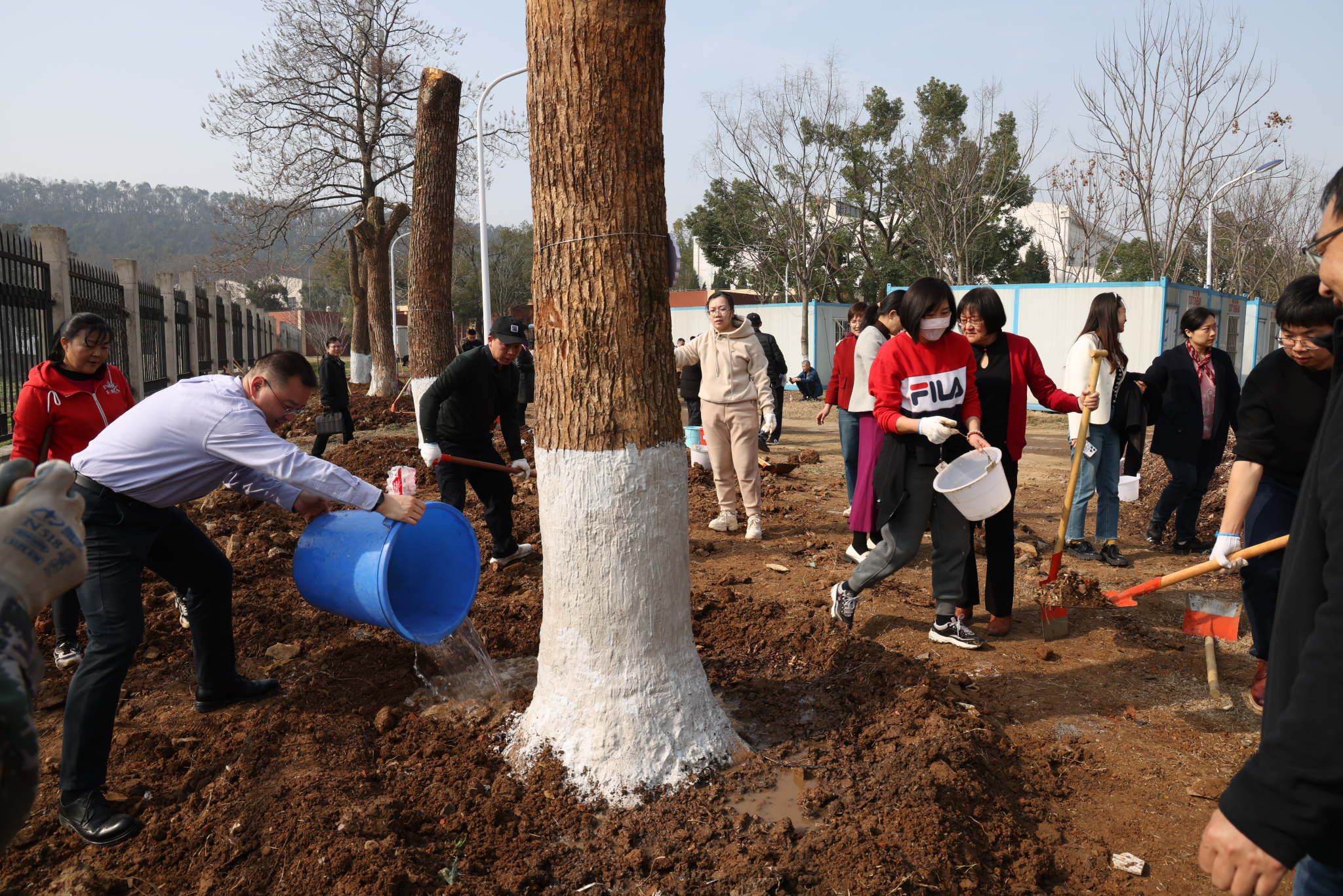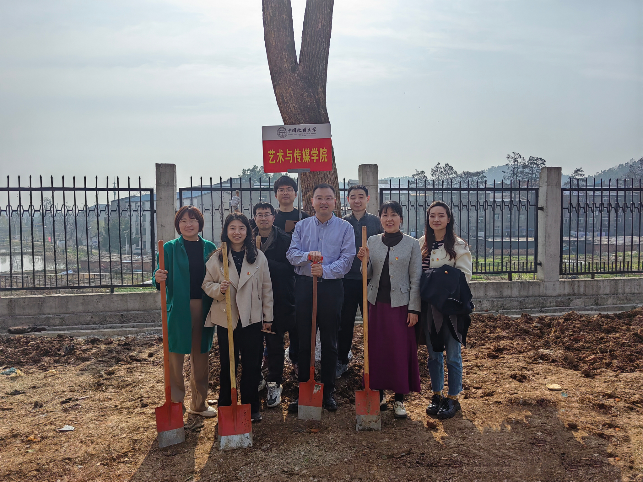 学院和学校办公室、党委组织部、党委统战部的老师们分为一组,大家互相配合,挥锹铲土、扶苗填坑、培土浇水并写下了植树节纪念牌,为建设美好地大校园贡献一份力量。